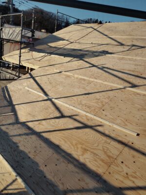 出来上がった野地板の上に屋根ルーフィングが敷かれ、