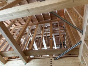 屋根の荷重が母屋、束、梁、柱へと伝わっていく様子を見ることができます。