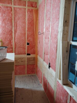 電気屋さんが配線工事を行い、その後外壁にグラスウールを施工します。