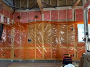 グラスウールを施工したあと、オレンジ色の気密シートを貼っていきます。