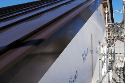 外部は土台水切りの板金、屋根の破風部分の板金工事が終了しました。