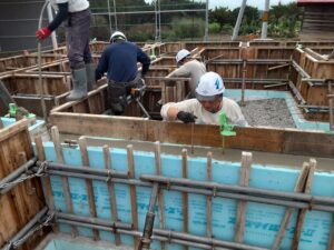 ベースコンクリートの養生期間を経て、布基礎の枠を組み立てていきます。