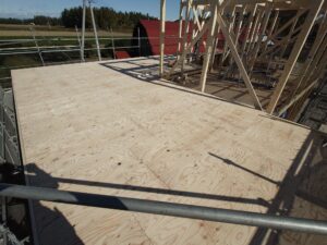 構造用合板、付加断熱施工を行い、屋根のルーフィング施工が行われました。
