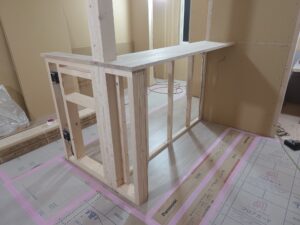 キッチン前の収納の骨組みを大工さんが造作します。
