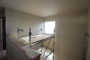 2階の石膏ボード張りが終わり、1階も張り進めていきます。