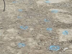 重機担当の方がわかるようにスプレーで印を付けてるんですよ。